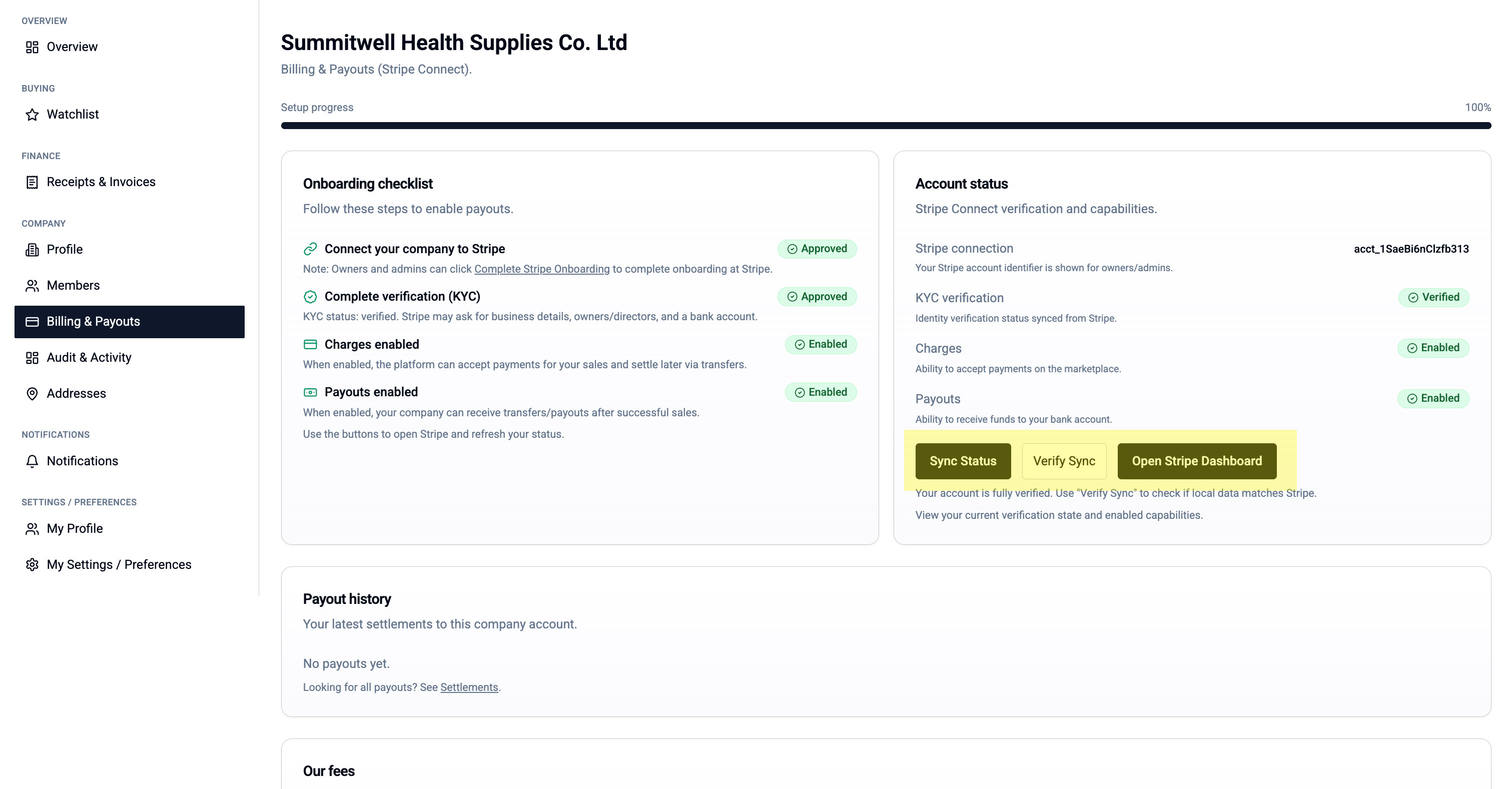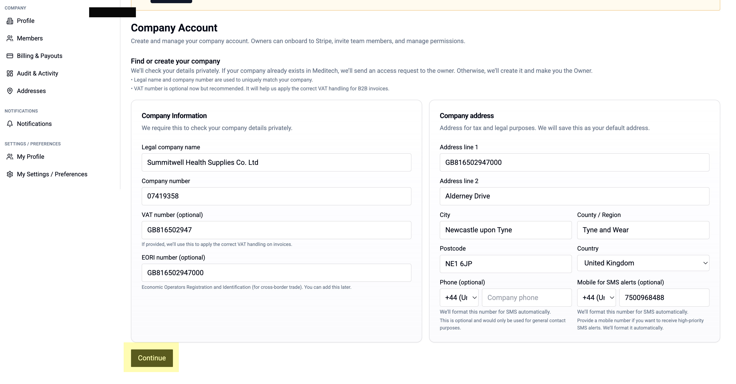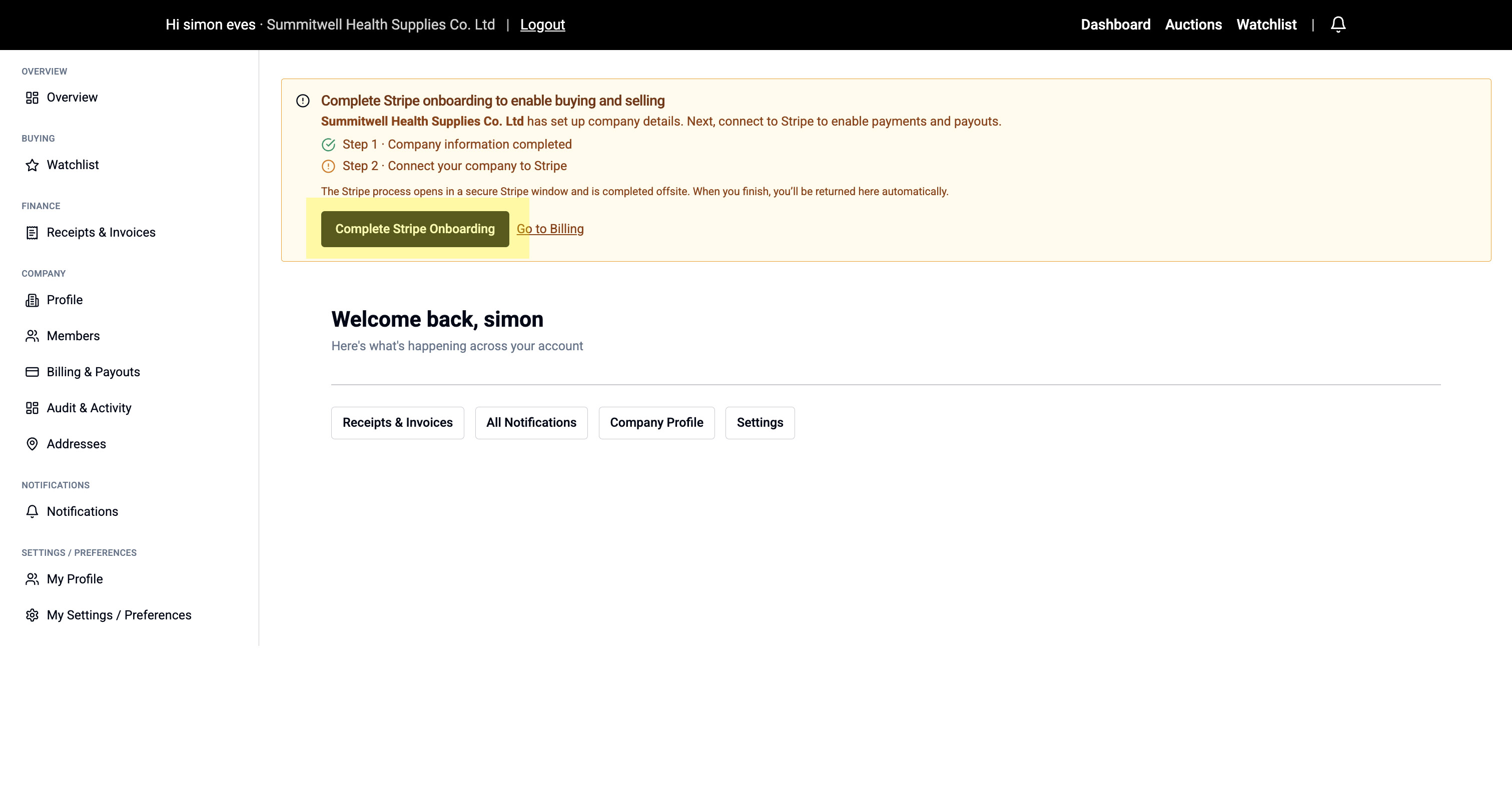 Before you can buy or sell on Meditech Auction, you need to complete your company setup. This includes adding your business details, connecting to Stripe for payments, and adding addresses.