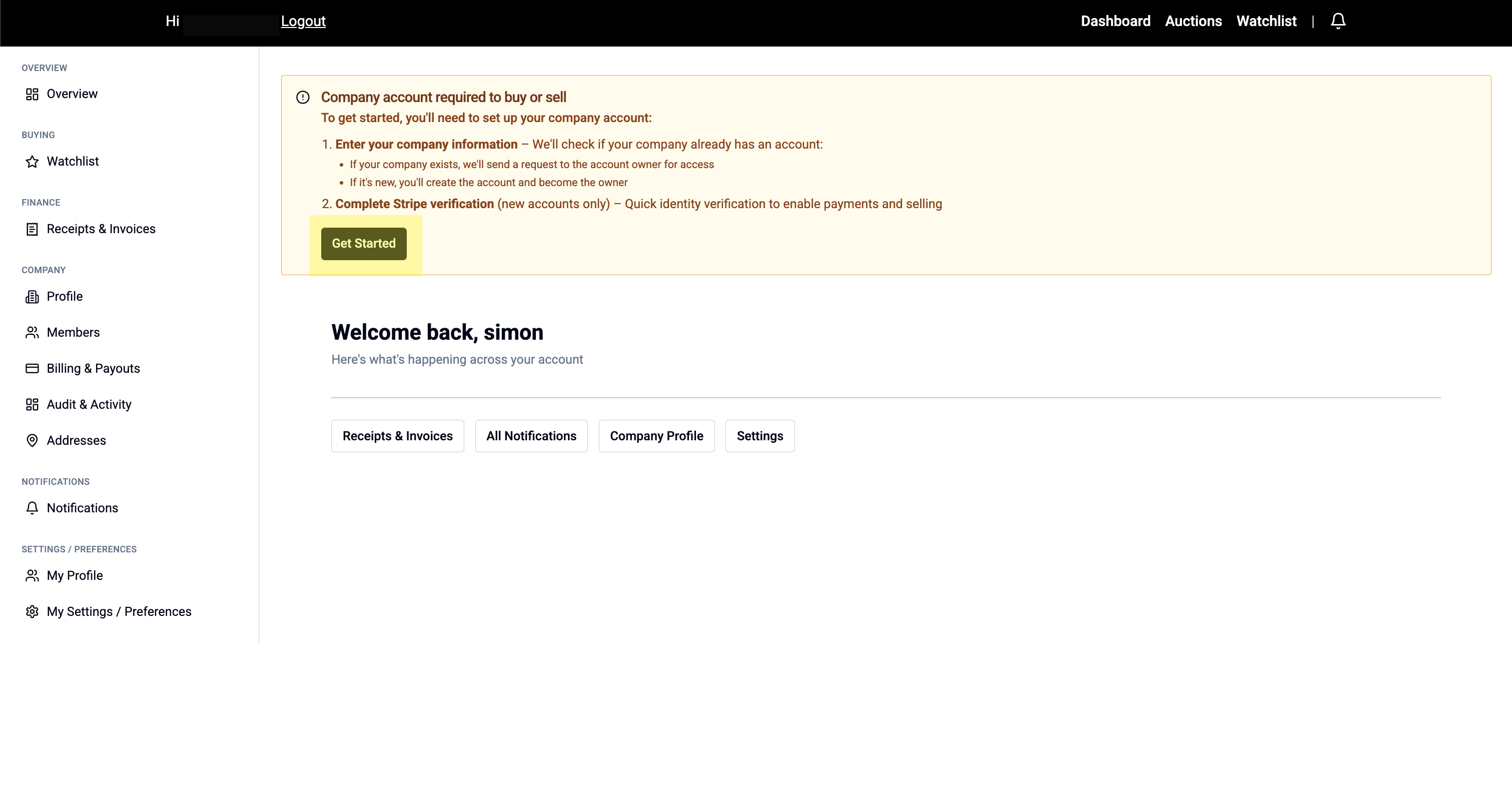 Next Steps Box: β Setup Complete! Your company is now ready to buy and sell. Learn how to create your first auction or start browsing listings.