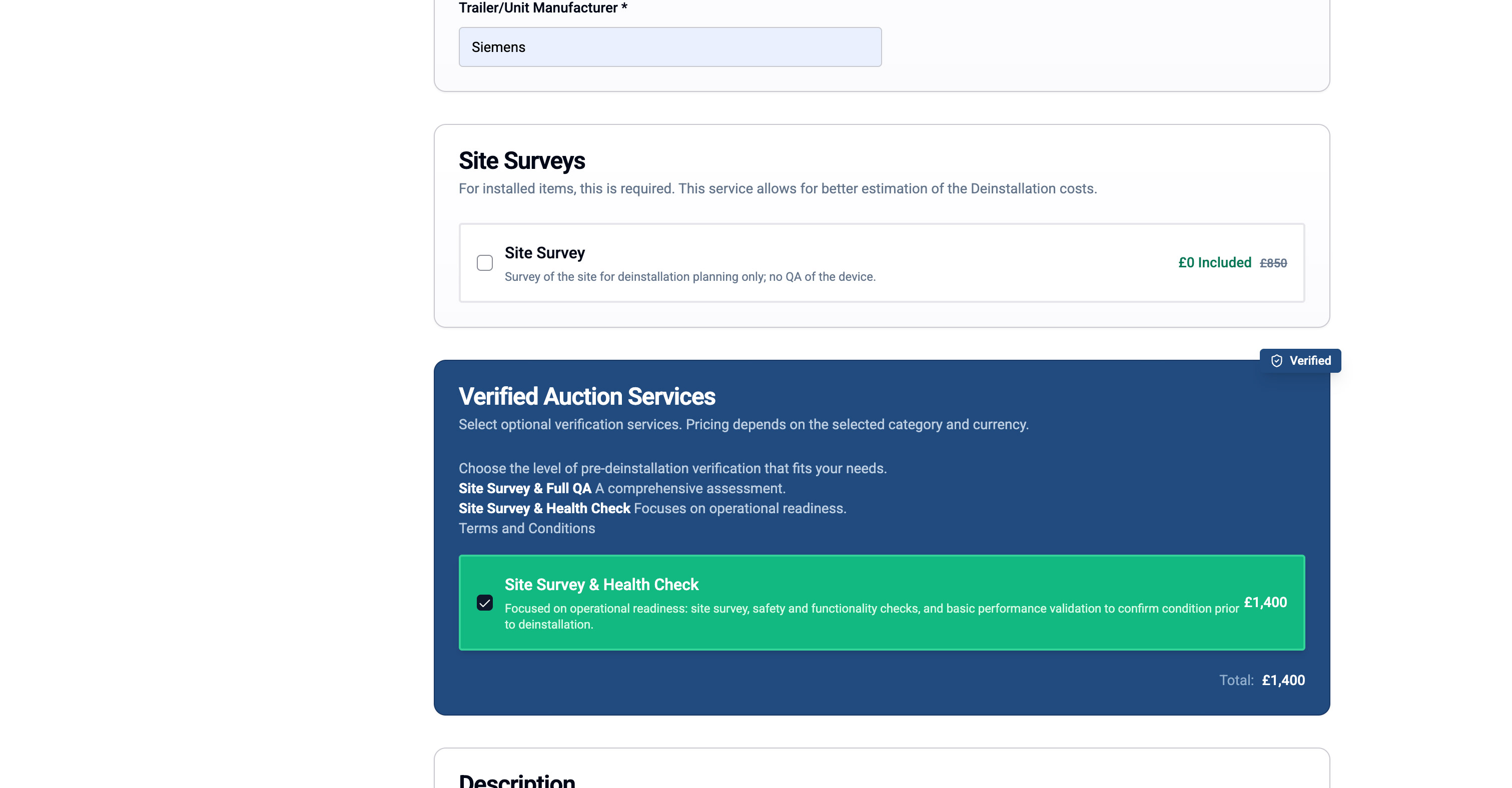 If your equipment is eligible for verification, you'll see "Verified Auction Services" options appear in the form.