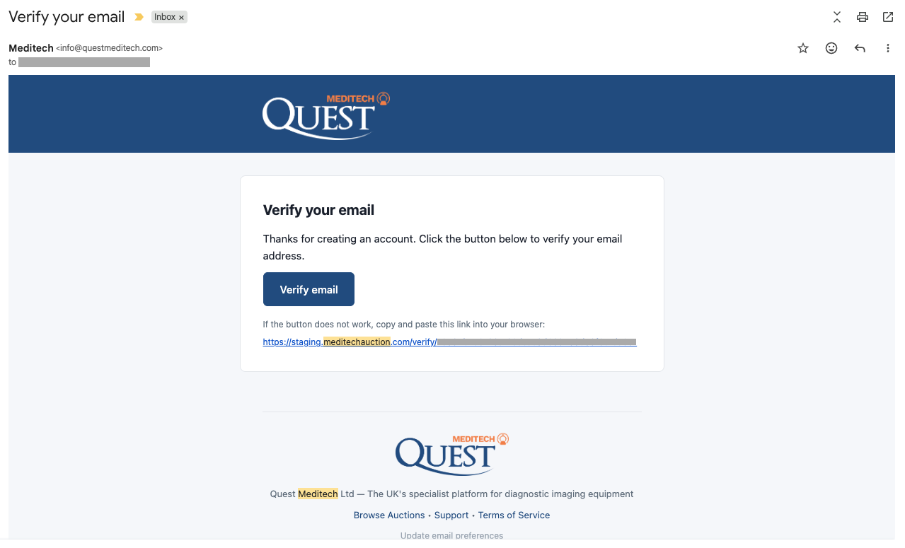 - Check your email inbox for a verification message from Meditech Auction
